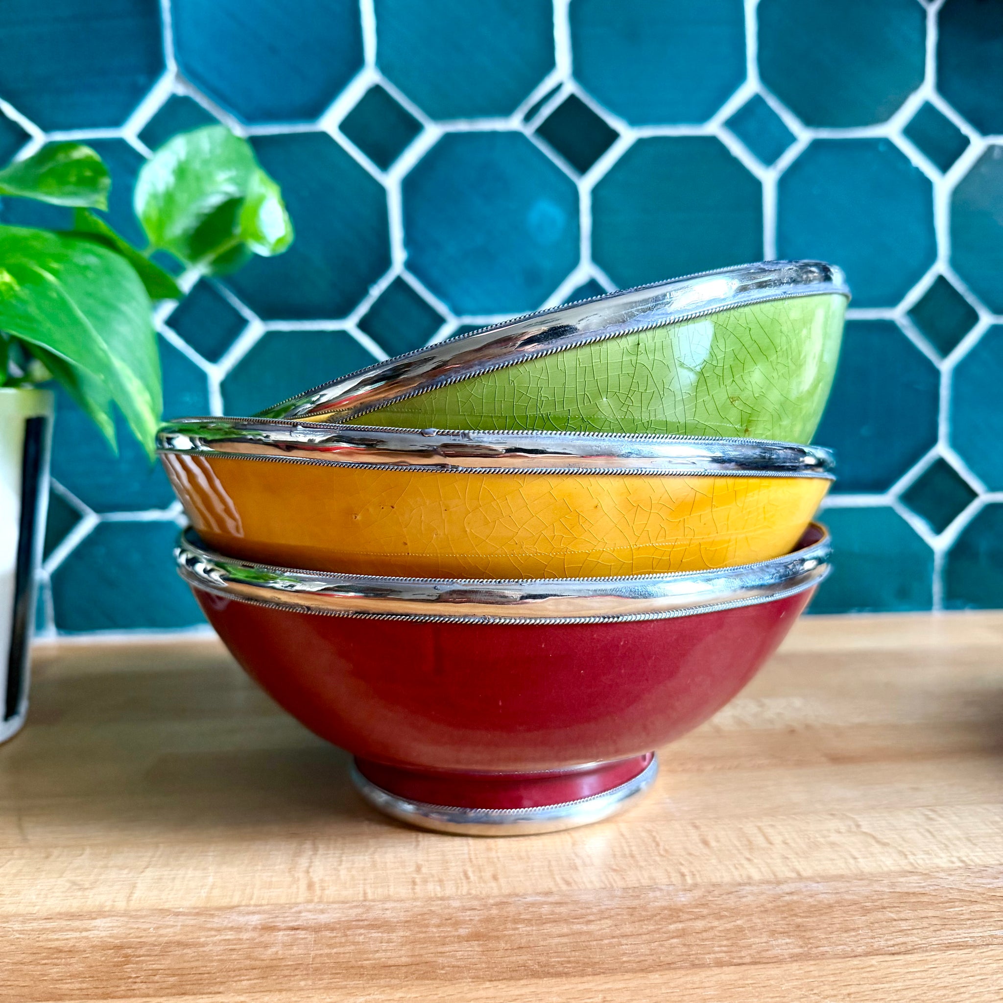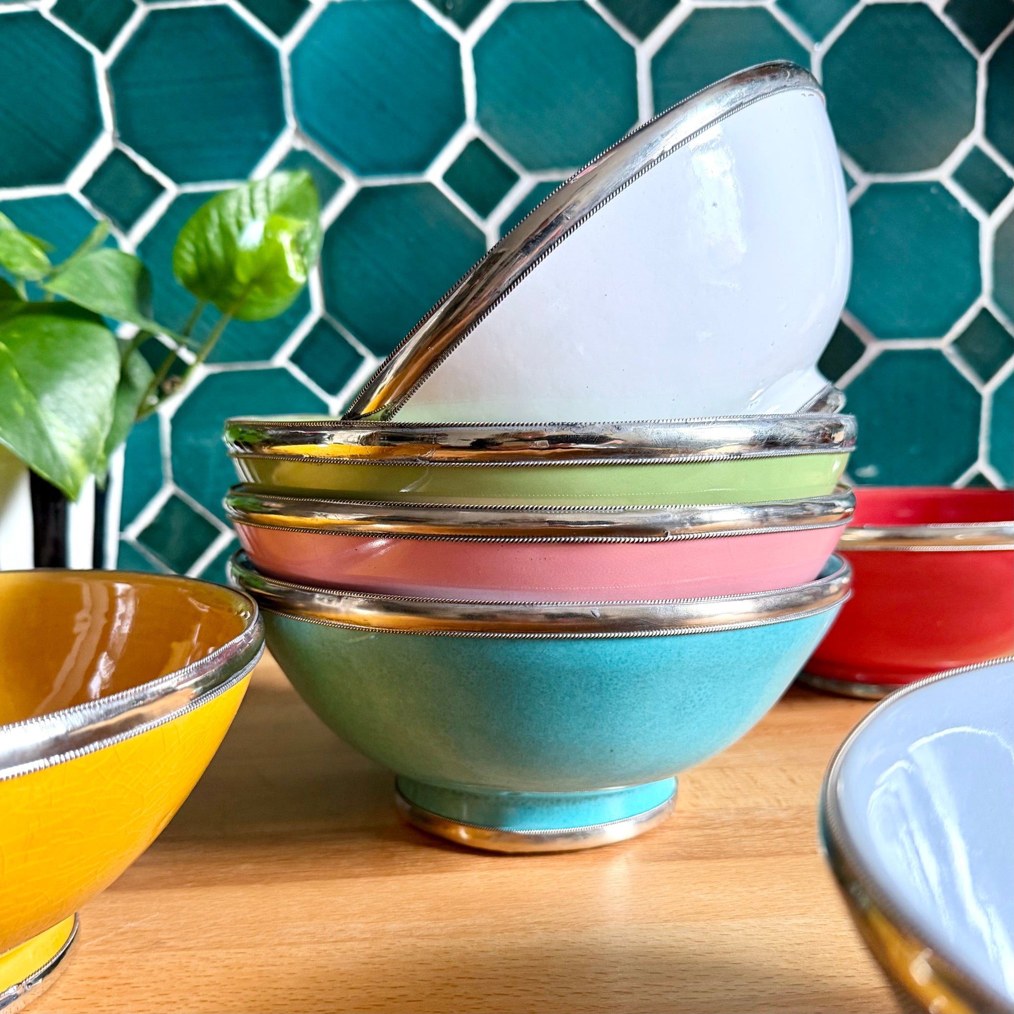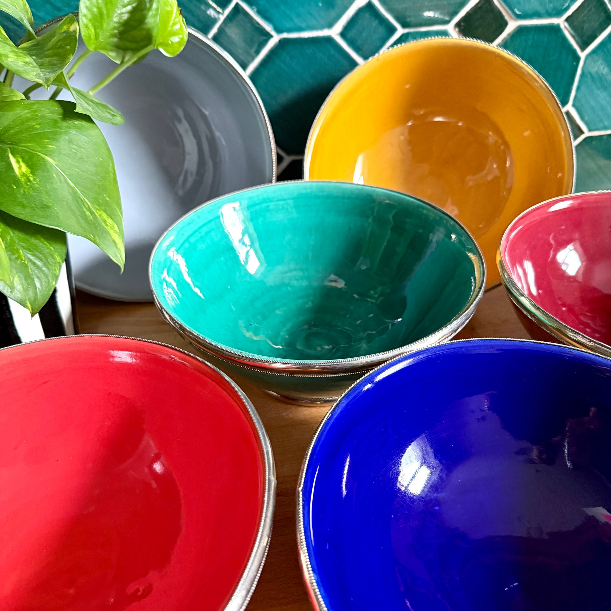 Entdecken Sie die Schönheit handgefertigter Keramikschalen aus Marokko – perfekt für Ramen, Salate, Suppen oder jedes andere Gericht Ihrer Wahl. Jede Schale vereint traditionelle marokkanische Handwerkskunst mit modernem Boho-Stil und ist somit ein einzigartiges und charmantes Unikat. Die Schalen werden von Kunsthandwerkern sorgfältig geformt und bemalt und anschließend mit einer zarten Silberbeschichtung versehen, die ihnen eine elegante Note und einen dezenten Glanz verleiht.